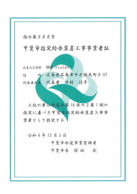 【News】 – 2022.12.05 – 2025-11-18 by N-Vision 山梨県 甲斐市 指定給水装置工事事業者証(指定番号 第388号)取得 令和4年12月5日 株式会社N-Visionは、山梨県甲斐市より 指定給水装置工事事業者(指定番号 第388号)の指定を取得致しました。