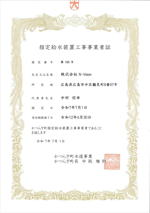 【News】 – 2025.07.01 – 2025-11-18 by N-Vision 和歌山県 伊都郡かつらぎ町 指定給水装置工事事業者証(指定番号 第185号)取得 令和7年7月1日 株式会社N-Visionは、伊都郡かつらぎ町より 指定給水装置工事事業者(指定番号 第185号)の指定を取得致しました。