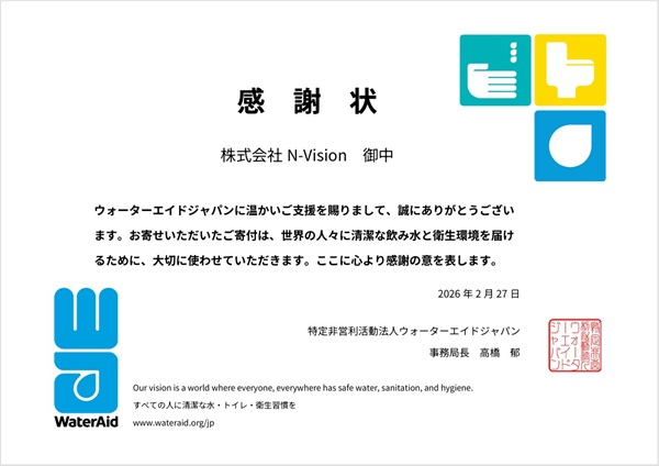株式会社N-Visionは、国際NGO法人ウォーターエイドの「すべての人々がすべての場所で、